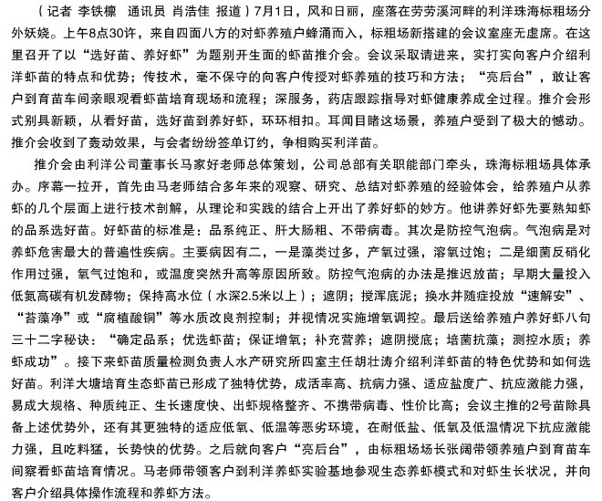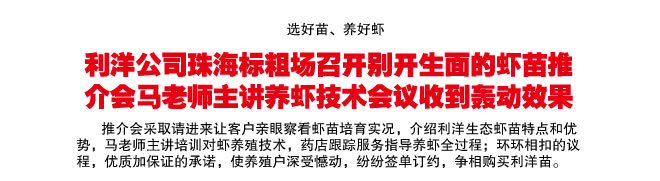 利洋公司珠海標(biāo)粗場召開別開生面的蝦苗推介會馬老師主講養(yǎng)蝦技術(shù)會議收到轟動效果