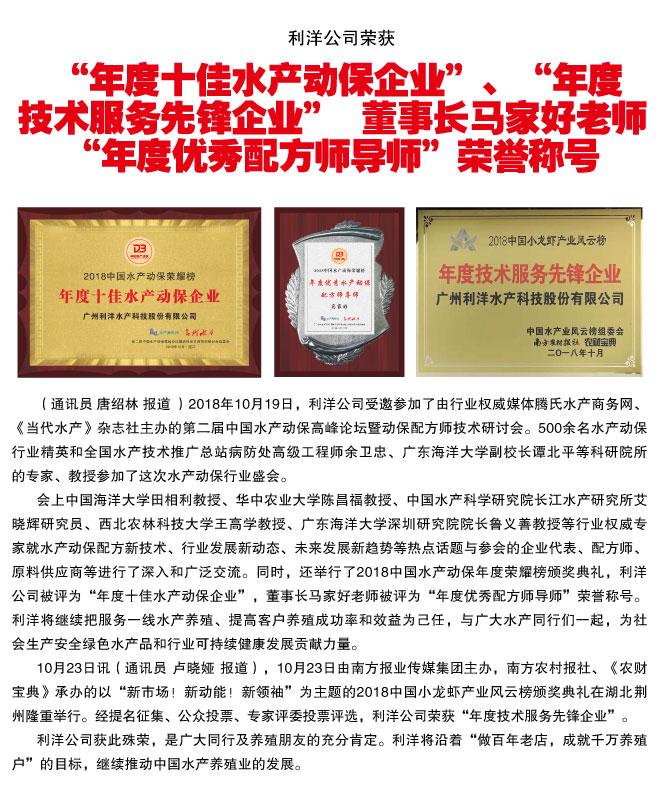 利洋公司榮獲 “年度十佳水產(chǎn)動保企業(yè)”、“年度技術(shù)服務(wù)先鋒企業(yè)” 董事長馬家好老師“年度優(yōu)秀配方師導(dǎo)師”榮譽(yù)稱號
