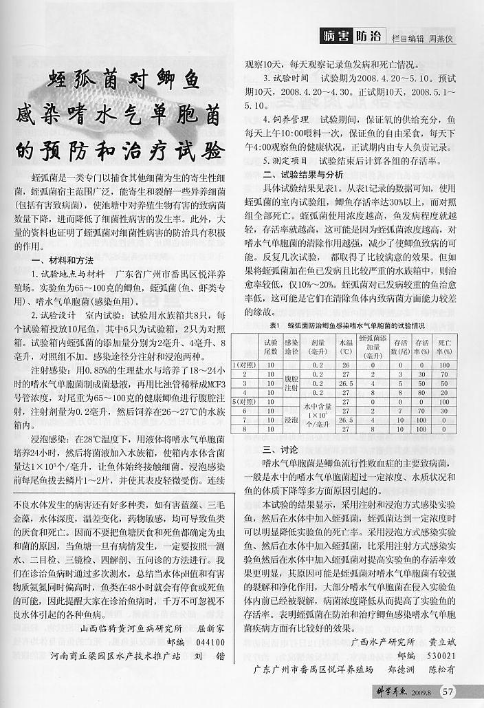 蛭弧菌對鯽魚感染嗜水氣單胞菌的預防和治療實驗