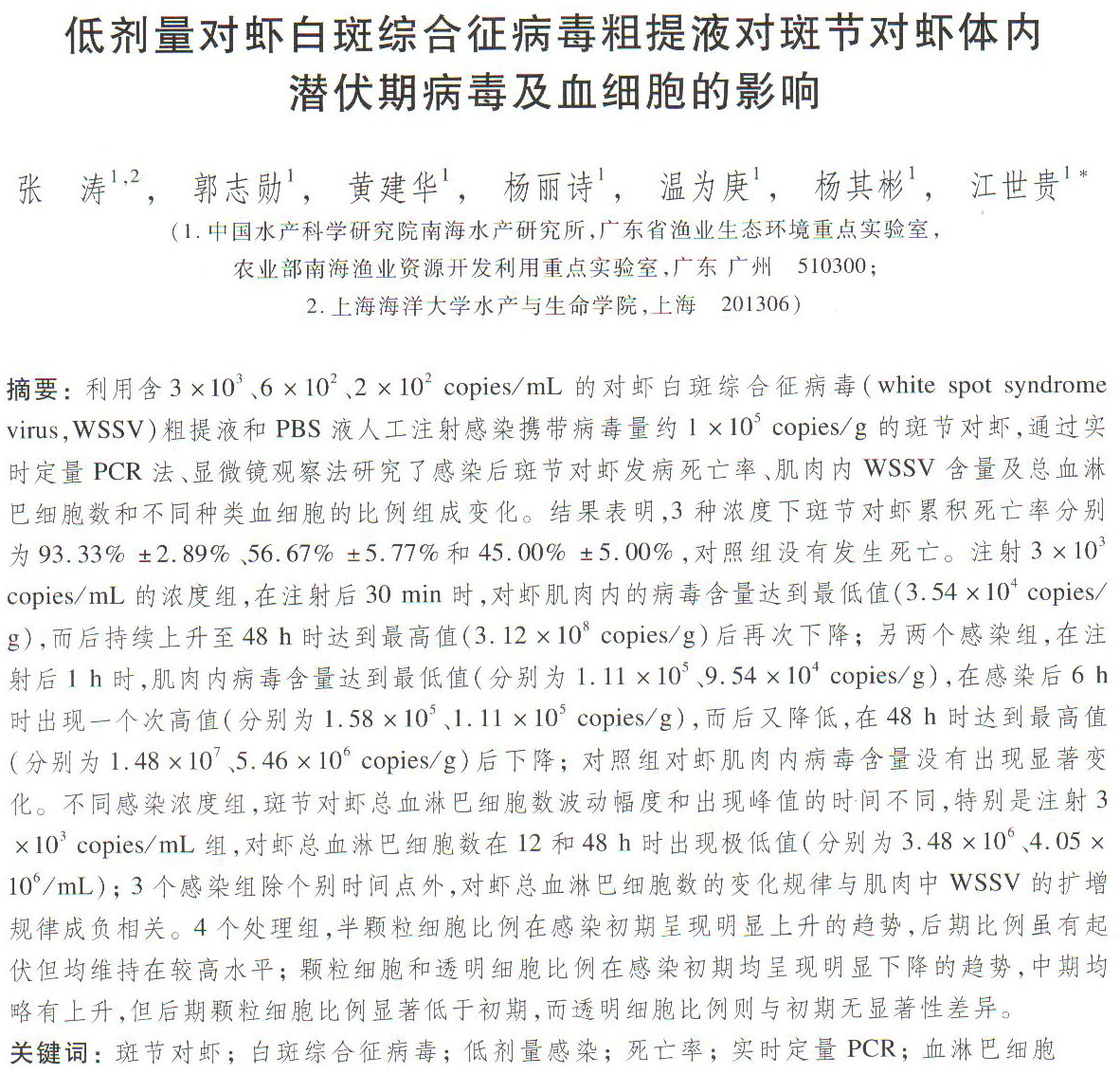 低劑量對蝦白斑綜合征病毒粗提液對斑節(jié)對蝦體內(nèi)潛伏期病毒及血細胞的影響