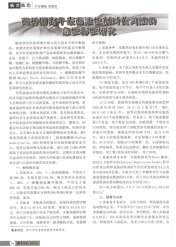 兩種陰離子表面活性劑對黃河鯉的急性毒性研究