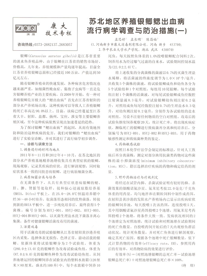 蘇北地區(qū)養(yǎng)殖銀鯽鰓出血病流行病學調(diào)查與防治措施(一)