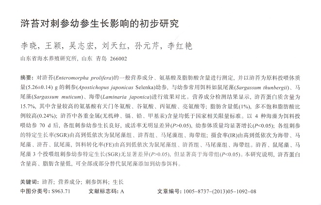 滸苔對(duì)刺參幼參生長(zhǎng)影響的初步研究
