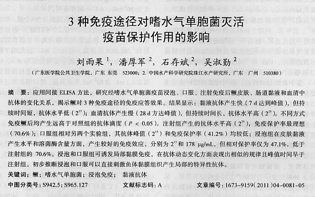 3種免疫途徑對嗜水氣單胞菌滅活疫苗保護作用的影響