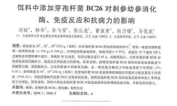 餌料中添加芽孢桿菌BC26對刺參幼參消化酶、免疫反應和抗病力的影響
