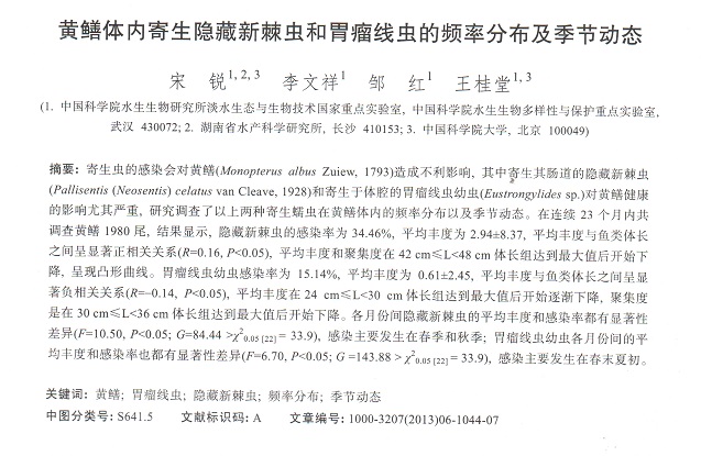 黃鱔體內(nèi)寄生隱藏新棘蟲和胃瘤線蟲的頻率分布及季節(jié)動(dòng)態(tài)