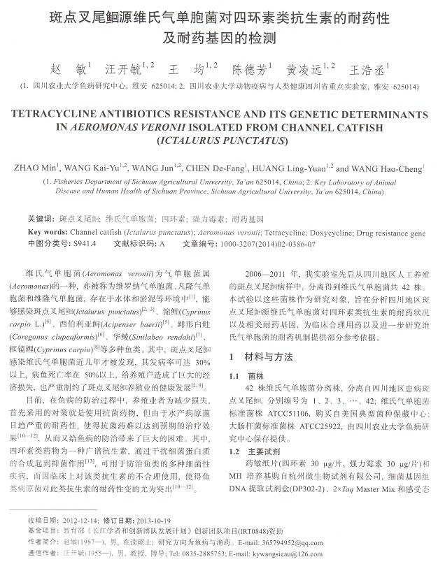 斑點叉尾鮰源維氏氣單胞菌對四環(huán)素類抗生素的耐藥性及耐藥基因的檢測