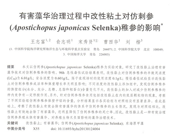 有害藻華治理過程中改性粘土對仿刺參(Apostichopus japonicas Selenka)稚參的影響