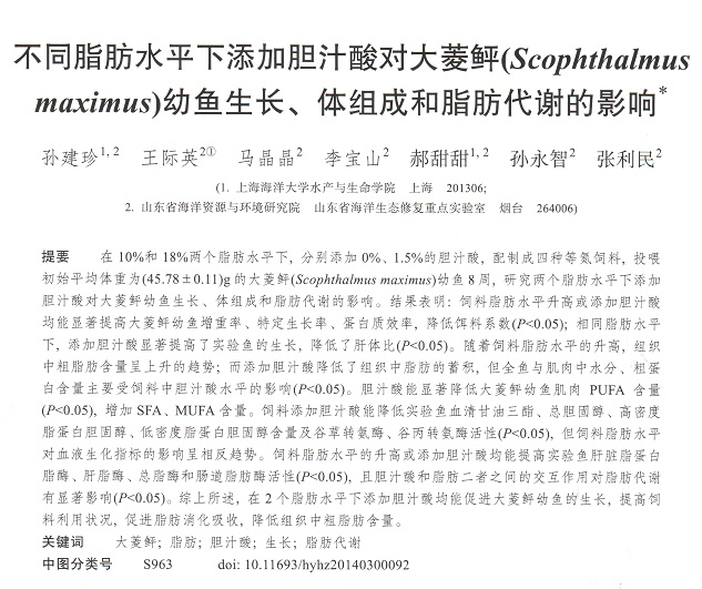 不同脂肪水平下添加膽汁酸對(duì)大菱鲆(Scophthalmus maximus)幼魚生長、體組成和脂肪代謝的影響