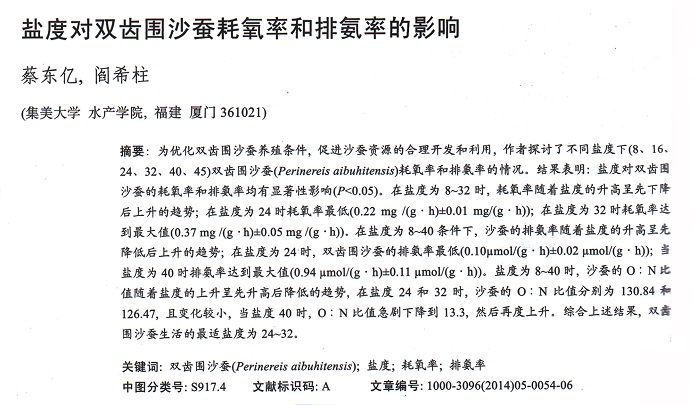 鹽度對雙齒圍沙蠶耗氧率和排氮率的影響