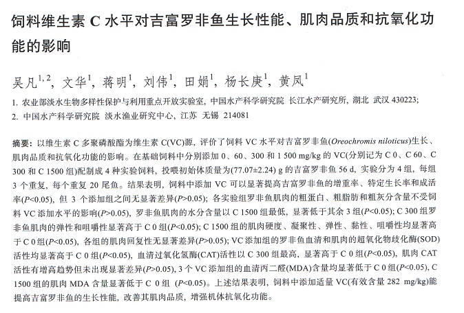 飼料維生素C水平對(duì)吉富羅非魚生長(zhǎng)性能、肌肉品質(zhì)和抗氧化功能的影響