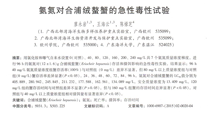 氨氮對合浦絨螯蟹的急性毒性試驗