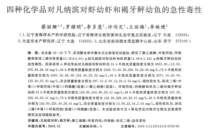 四種化學(xué)品對(duì)凡納濱對(duì)蝦幼蝦和褐牙鲆幼魚的急性毒性