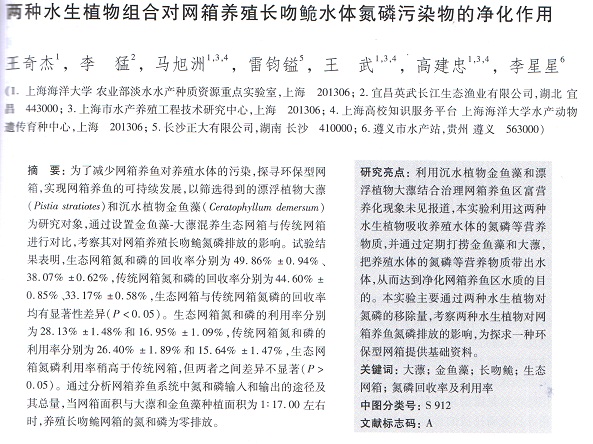 兩種水生植物組合對(duì)網(wǎng)箱養(yǎng)殖長(zhǎng)吻鮠水體氮磷污染物的凈化作用