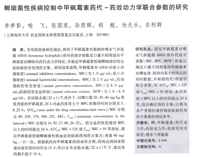 鯽細菌性疾病控制中甲砜霉素藥代-藥效動力學聯(lián)合參數(shù)的研究