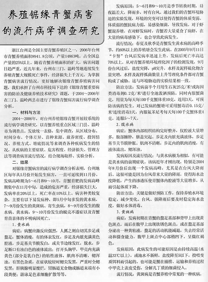 養(yǎng)殖鋸緣青蟹病害的流行病學(xué)調(diào)查研究1
