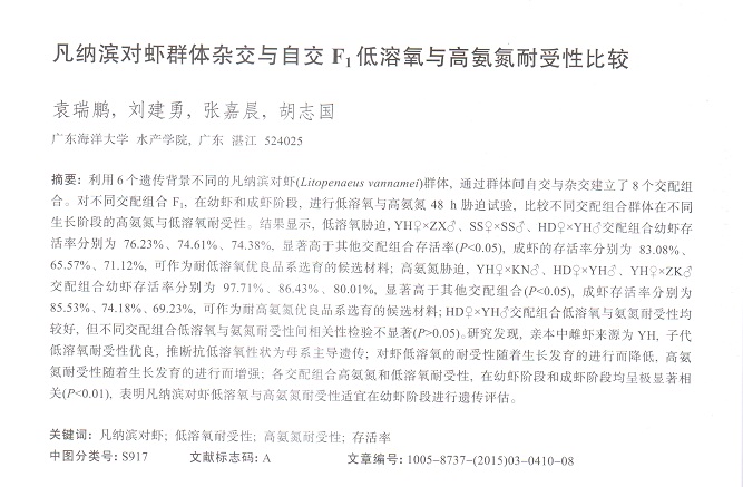 凡納濱對(duì)蝦群體雜交與自交F1低溶氧與高氨氮耐受性比較