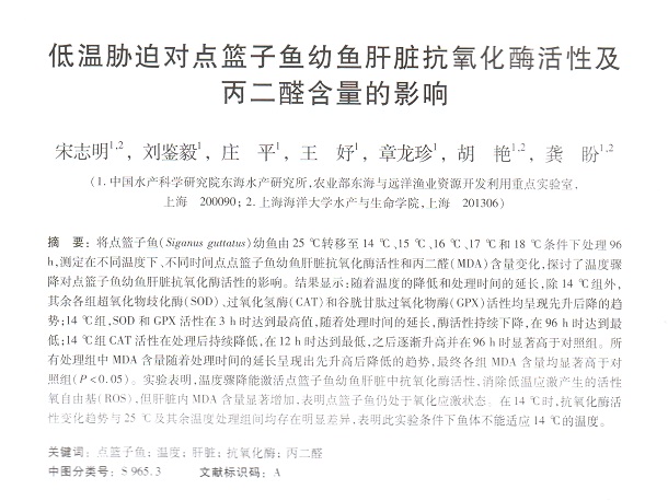 低溫脅迫對(duì)點(diǎn)籃子魚幼魚肝臟抗氧化酶活性及丙二醛含量的影響