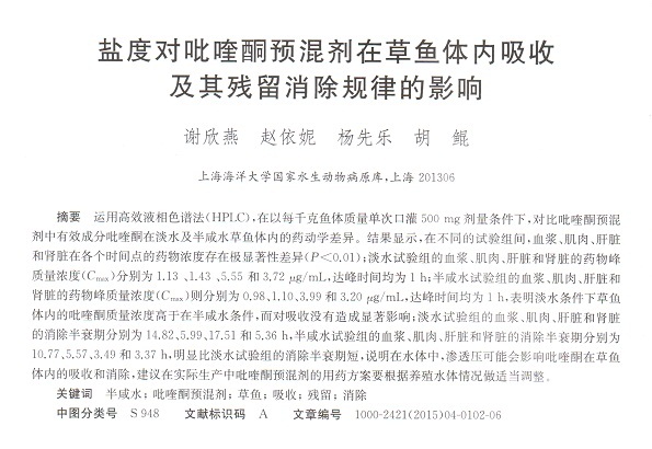 鹽度對吡喹酮預(yù)混劑在草魚體內(nèi)吸收及其殘留消除規(guī)律的影響