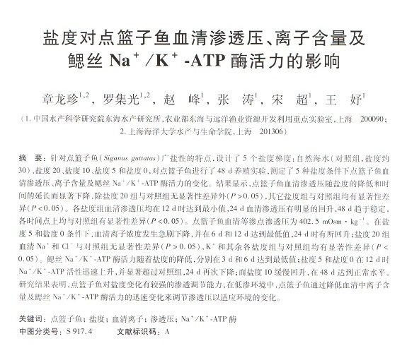 鹽度對(duì)點(diǎn)籃子魚血清滲透壓、離子含量及鰓絲Na+/K+-ATP酶活力的影響