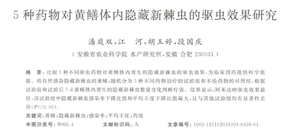 5種藥物對(duì)黃鱔體內(nèi)隱藏新棘蟲的驅(qū)蟲效果研究