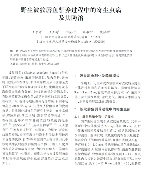 野生波紋唇魚馴養(yǎng)過程中的寄生蟲病及其防治