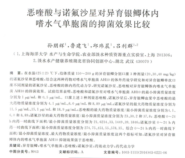 惡喹酸與諾氟沙星對(duì)異育銀鯽體內(nèi)嗜水氣單胞菌的抑菌效果比較