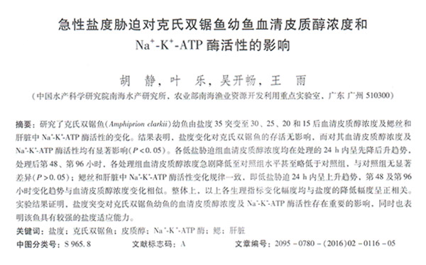 急性鹽度脅迫對克氏雙鋸魚幼魚血清皮質醇濃度和Na+-K+-ATP酶活性的影響