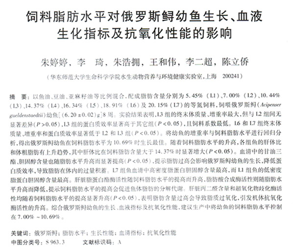 飼料脂肪水平對(duì)俄羅斯鱘幼魚生長(zhǎng)、血液生化指標(biāo)及抗氧化性能的影響