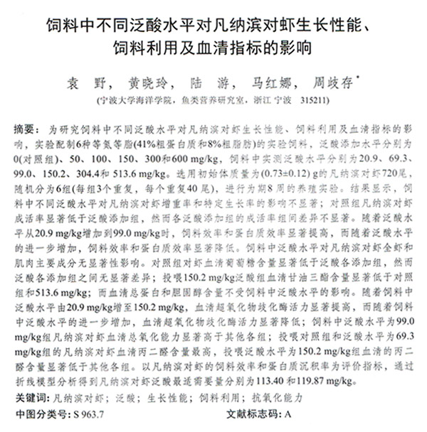 飼料中不同泛酸水平對(duì)凡納濱對(duì)蝦生長(zhǎng)性能、飼料利用及血清指標(biāo)的影響