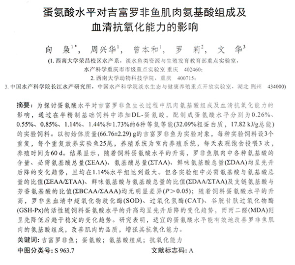 蛋氨酸水平對吉富羅非魚肌肉氨基酸組成及血清抗氧化能力的影響