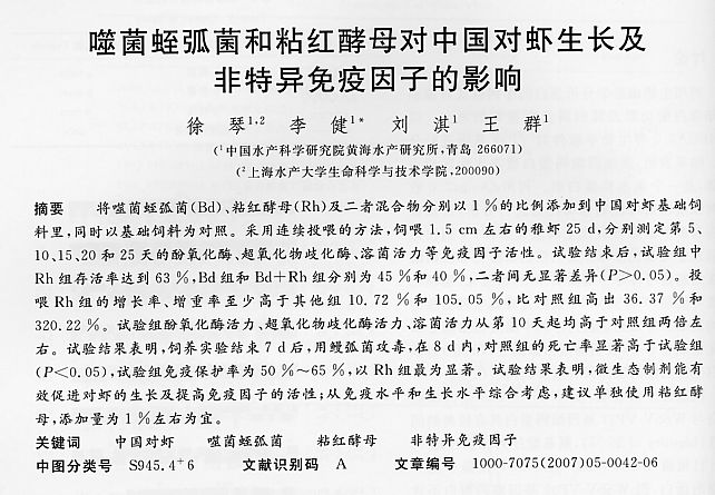 噬菌蛭弧菌和粘紅酵母對(duì)中國(guó)對(duì)蝦生長(zhǎng)及非特異免疫因子的影響 ()