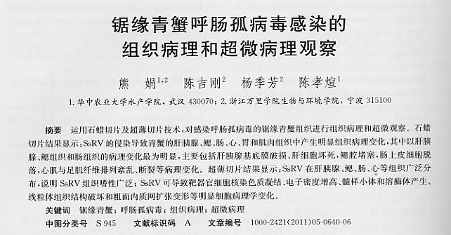 鋸緣青蟹呼腸孤病毒感染的組織病理和超微病理觀察