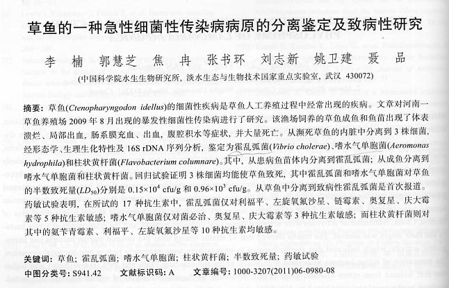 草魚(yú)的一種急性細(xì)菌性傳染病病原的分離鑒定及致病性研究