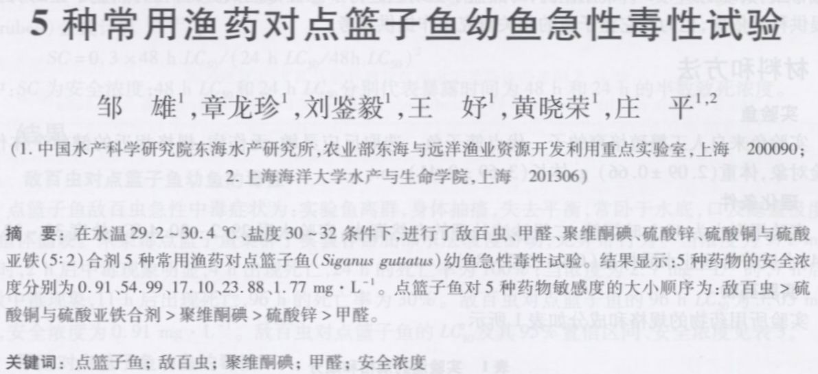 5種常用漁藥對點(diǎn)籃子魚幼魚急性毒性試驗(yàn)