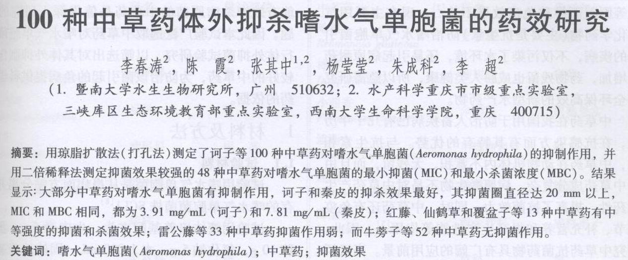 100種中草藥體外抑殺嗜水氣單胞菌的藥效研究