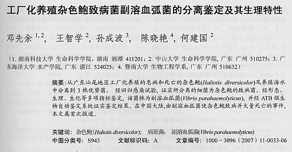 工廠(chǎng)化養(yǎng)殖雜色鮑致病菌副溶血弧菌的分離鑒定及其生理特征