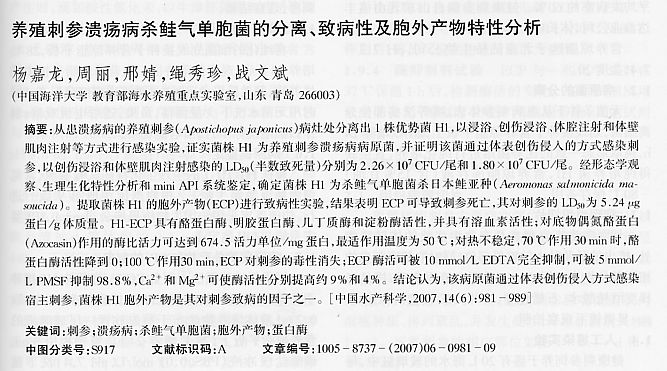 養(yǎng)殖刺參潰瘍病殺鮭氣單胞菌的分離、致病性及胞外產(chǎn)物特征分析