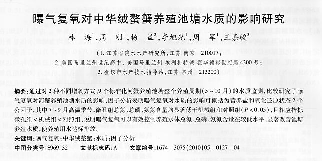 曝氣復(fù)氧對中華絨螯蟹養(yǎng)殖池塘水質(zhì)的影響研究