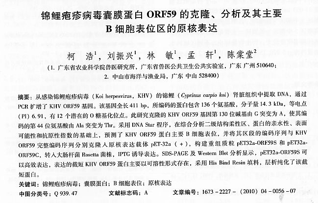 錦鯉皰疹病毒膜蛋白ORF59的克隆、分析及其主要B細胞表位區(qū)的原核表達