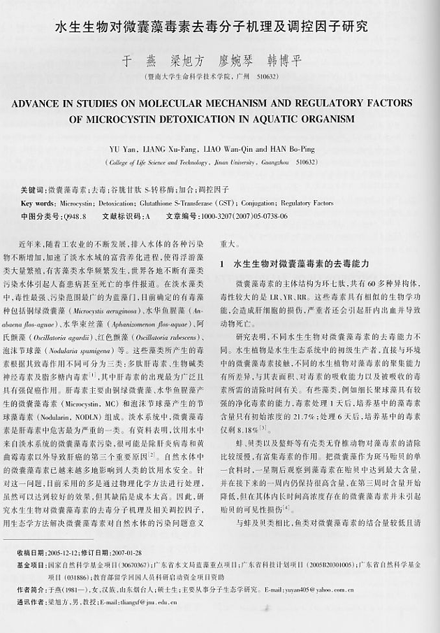 水產(chǎn)生物對(duì)微囊藻毒素去毒分子機(jī)理及調(diào)控因子研究1