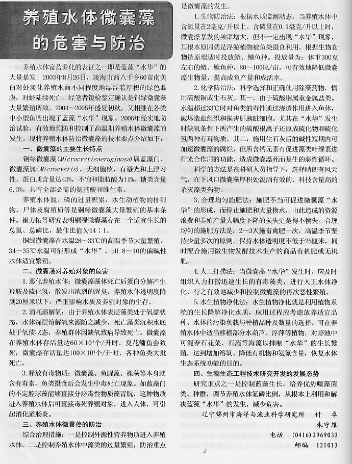 養(yǎng)殖水體微囊藻的危害與防治
