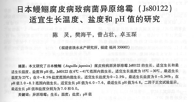 日本鰻鱺腐皮病致病菌綿霉(Js80122)適宜生長溫度、鹽度和pH值的研究