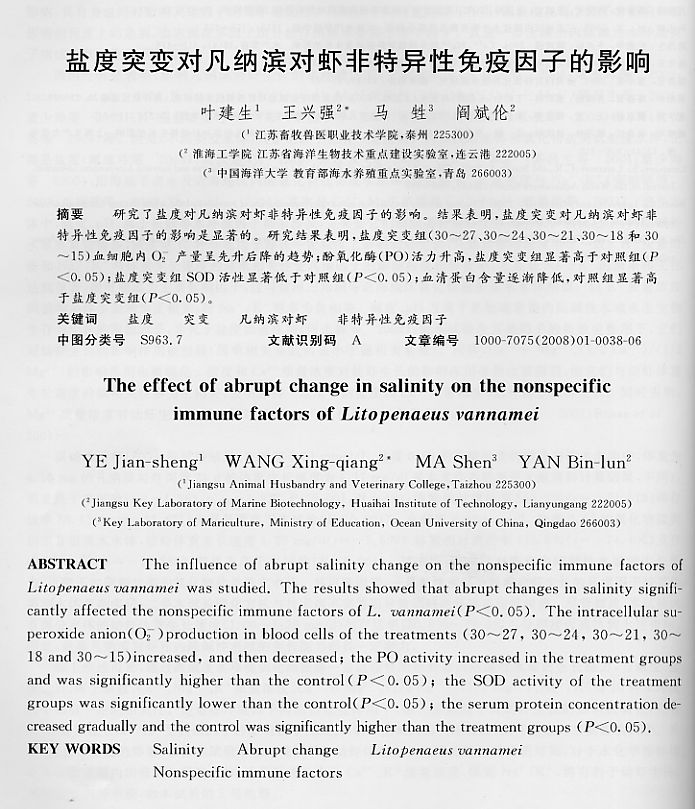 鹽度突變對(duì)凡納濱對(duì)蝦非特異性免疫因子的影響1