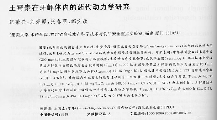 土霉素在牙鲆體內(nèi)的藥代動力學研究1