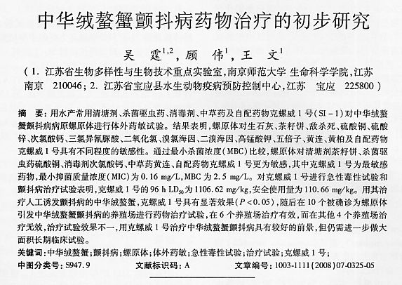 中華絨螯蟹顫抖病藥物治療的初步研究