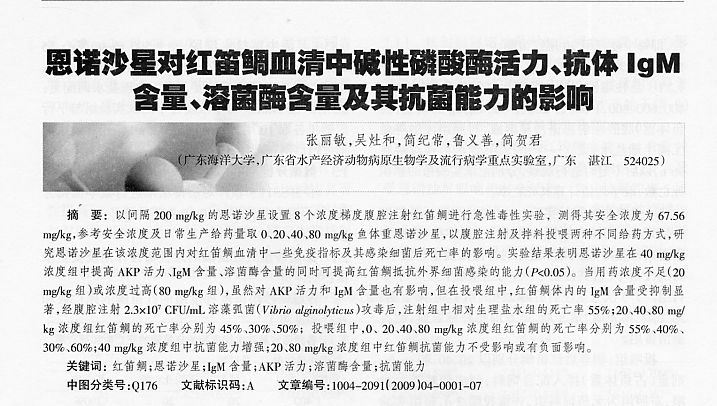恩諾沙星對紅笛鯛血清中堿性磷酸酶活力、抗體lgM含量、溶菌酶含量及其抗菌能力的影響