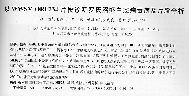 以WWWSV ORF234 片段診斷羅氏沼蝦白斑病毒病及片段分析