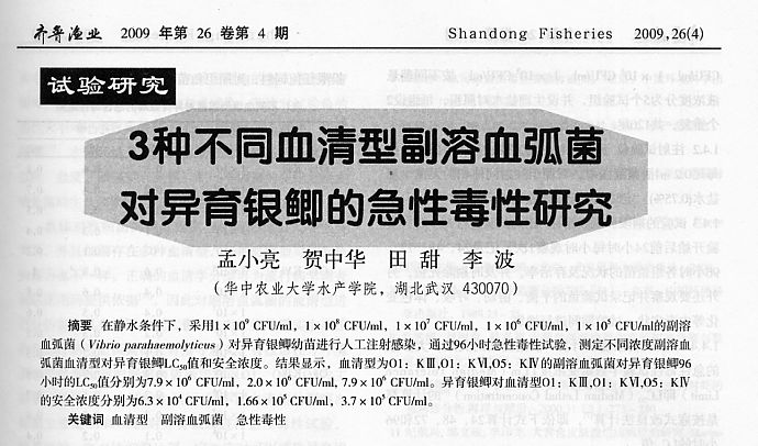 3種不同血清型副溶血弧菌對異育銀鯽的急性毒性研究