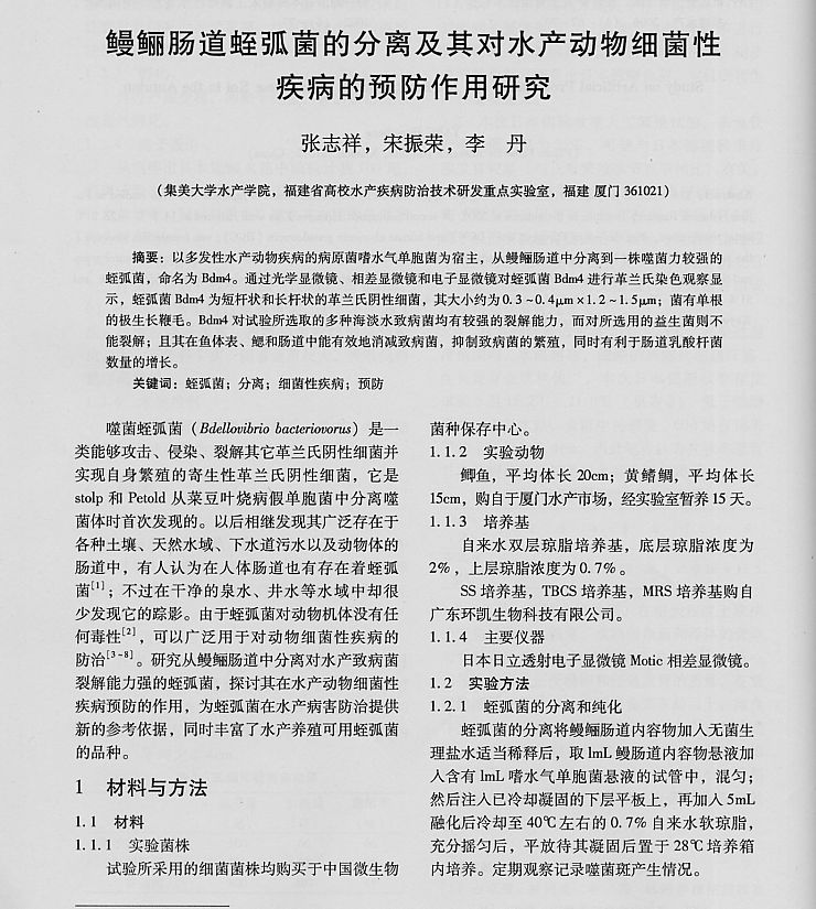 鰻鱺腸道蛭弧菌的分離及其對(duì)水產(chǎn)動(dòng)物細(xì)菌性疾病的預(yù)防作用研究1